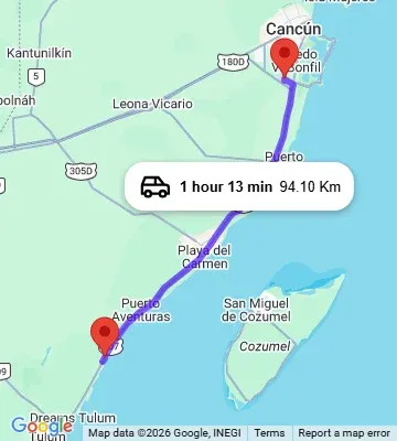 The ride from Cancun Airport to Akumal Bay Beach and Wellness Resort takes 75–90 minutes in a private shuttle, depending on traffic.