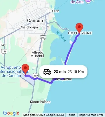 The ride from Cancun Airport to Hotel Riu Cancun takes 30–40 minutes in a private shuttle, depending on traffic.
