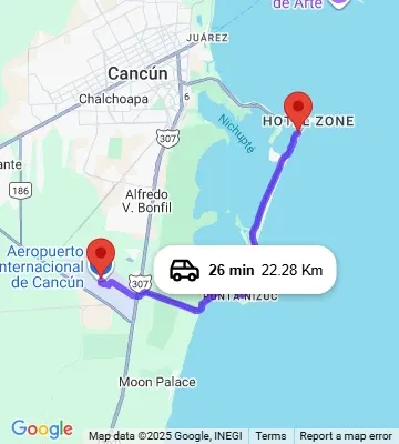 The ride from Cancun Airport to Royalton Chic Suites Cancun Resort and Spa takes 30–40 minutes in a private shuttle, depending on traffic.